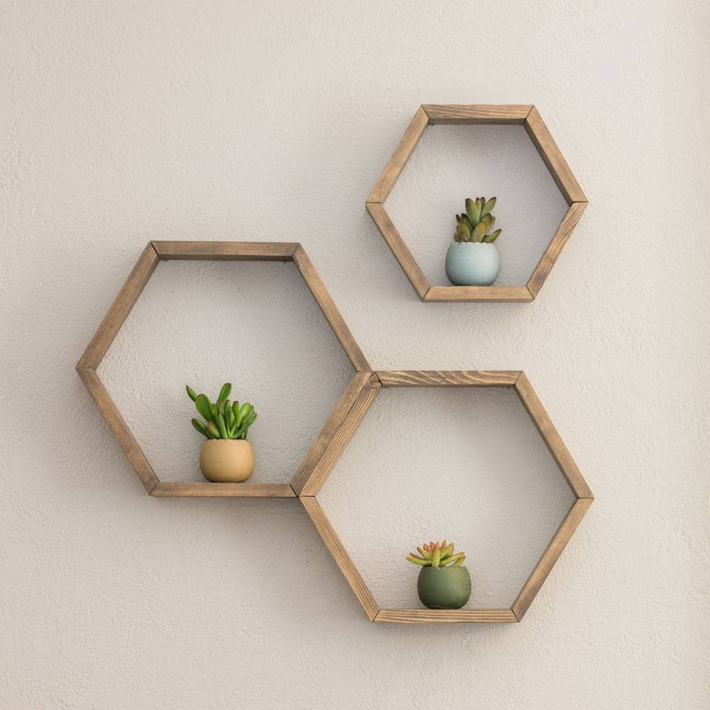Diese hübsche Dreier-Kombi läßt sich flexibel an der Wand arrangieren. Setzen Sie kleine Pflanzen, Vasen oder andere Lieblingsgegenstände in Szene. Das wabenförmige Wandreagel ist aber auch schon ohne Imhalt ein Blickfang an jeder Wand.